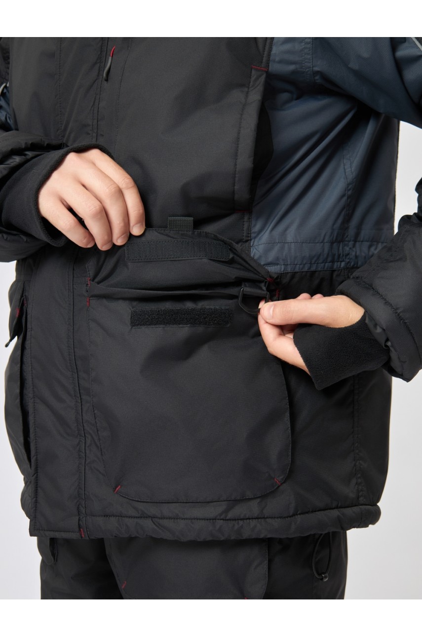 У куртки есть симметричные нагрудные карманы для согревания рук, вместительные накладные карманы по низу куртки, один нагрудный карман с водоотталкивающей молнией, кулиса для регулировки объёма талии, светоотражающий кант  и принт с логотипом, обеспечивающий видимость в темноте. Полукомбинезон имеет эластичный пояс на спине, регулируемые бретели, вместительные двойные накладные карманы спереди, усиленные двойной тканью детали колен и задней части. Ластовица обеспечивает свободу движений ног, защищая швы от разрывов.